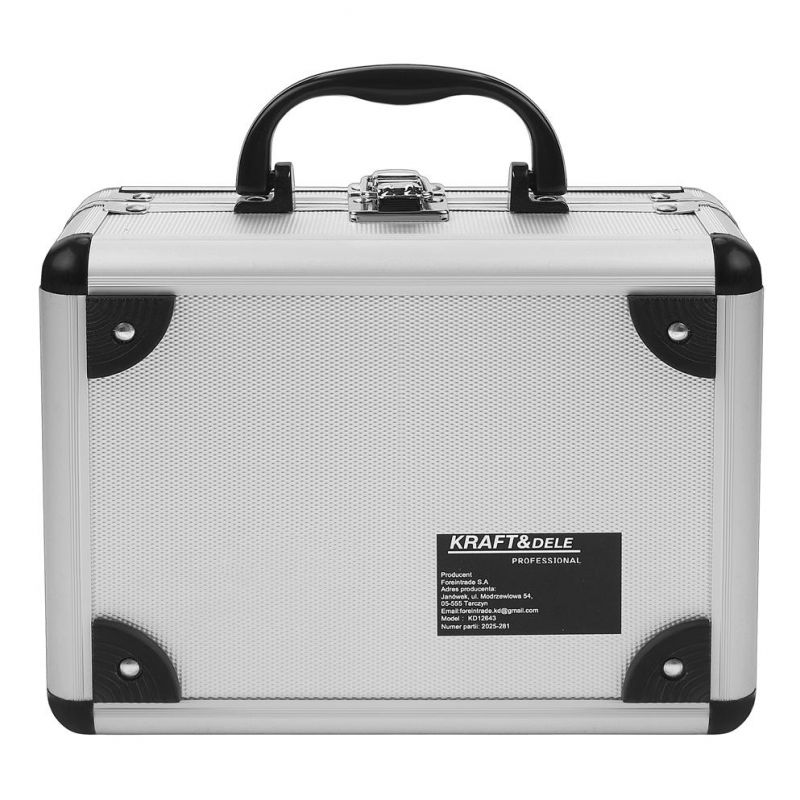 Componentele setului au fost ambalate cu grija intr-o cutie robusta, cu maner de transport si catarama incuiabila, ceea ce faciliteaza organizarea uneltelor si depozitarea lor in siguranta.