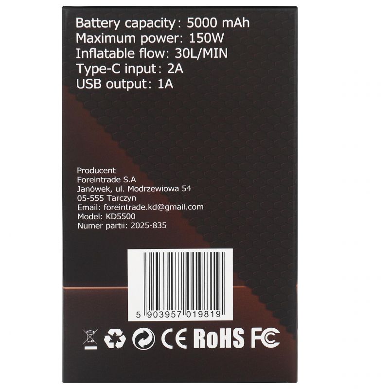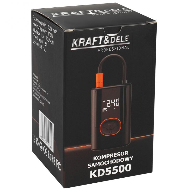 Compresorul fara fir KRAFT&DELE KD5500 este un dispozitiv modern, multifunctional, conceput pentru pompare. Cu designul sau compact, performante ridicate si bateria incorporata de 5000mAh, compresorul ofera mobilitate completa si independenta fata de sursele de alimentare.