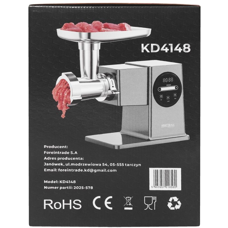 KD4148 este o masina de tocat carne eficienta si profesionala de 2500 W, conceputa pentru uz casnic si semi-profesional. Echipat cu un afisaj tactil si control al vitezei, va permite sa reglati cu precizie lucrarea la tipul de carne si la consistenta asteptata. Mecanismul planetar garanteaza o macinare uniforma si eficienta, asigurand o capacitate maxima de pana la 4 kg/min.