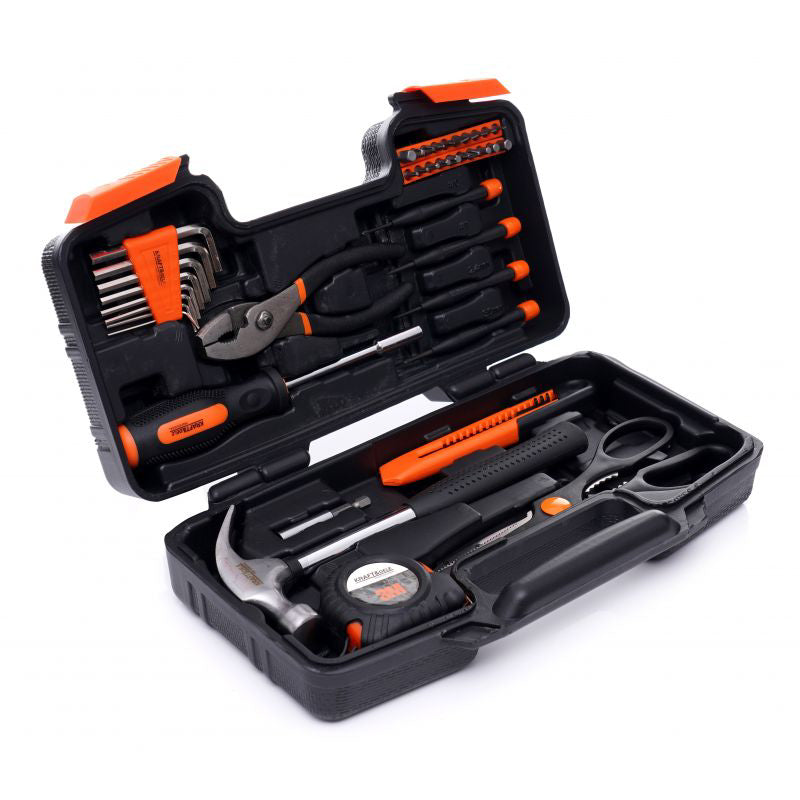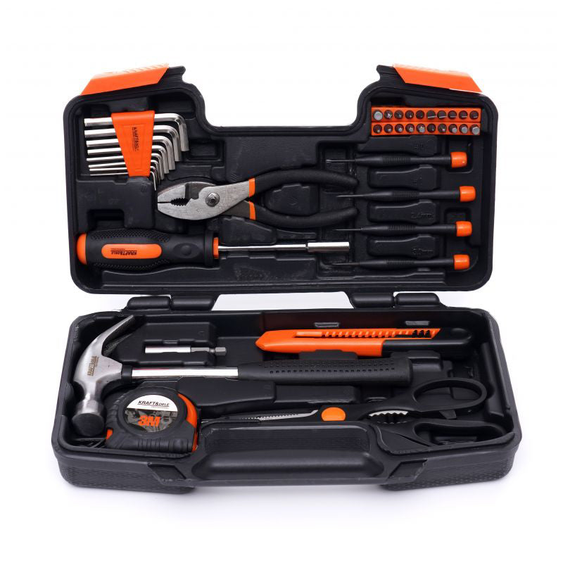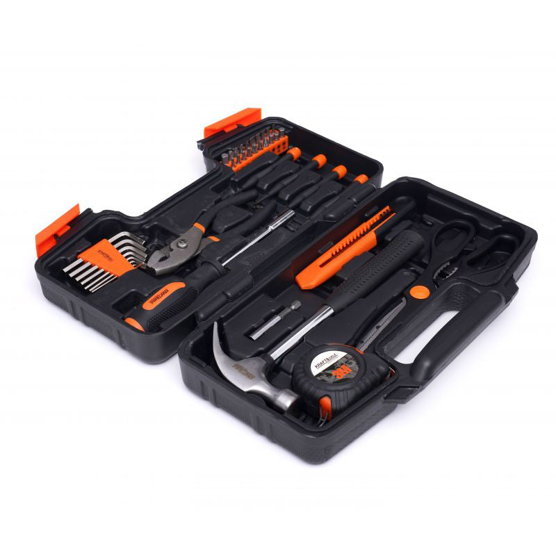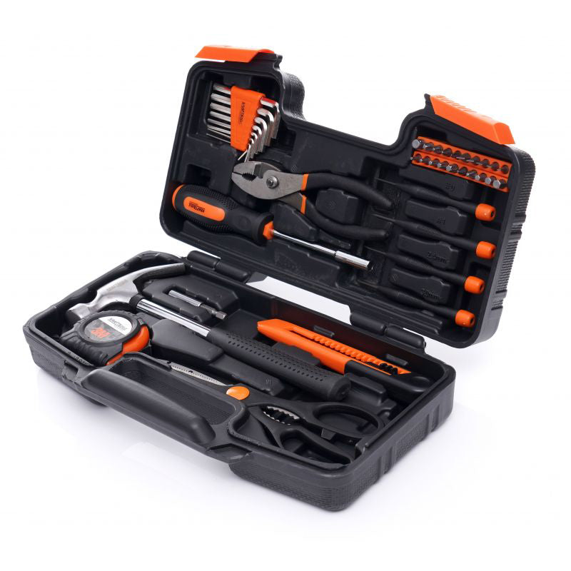 Intregul set este format din 40 de elemente diferite care va vor asigura selectia corecta a instrumentului pentru nevoile dumneavoastra. Sculele sunt fabricate din otel crom vanadiu (CrV) intarit, destinat sculelor de atelier. Cromul garanteaza otelului rezistenta la coroziune, oxidare, abraziune si rezistenta ridicata la temperaturi ridicate. Adaugarea de vanadiu inhiba cresterea boabelor in timpul procesarii, crescand in acelasi timp ductilitatea formelor stinse si revenite.