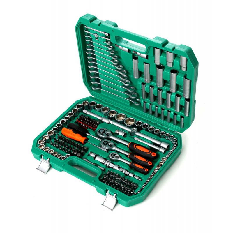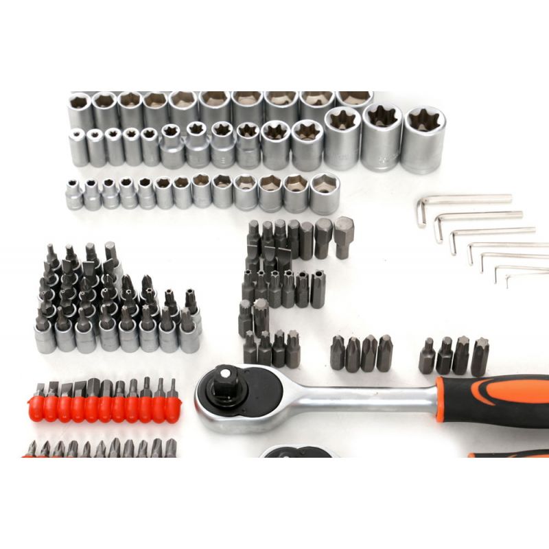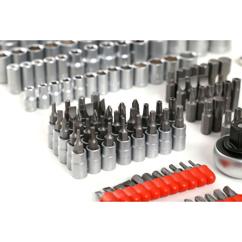 Intregul set este format din 216 elemente diferite care vor asigura selectarea corecta a sculei pentru a va satisface nevoile. Uneltele sunt fabricate din otel crom-vanadiu (CrV) calit, conceput pentru unelte de atelier. Cromul garanteaza rezistenta otelului la coroziune, oxidare, abraziune si rezistenta ridicata la temperaturi ridicate. Adaugarea de vanadiu inhiba cresterea boabelor in timpul procesarii, crescand in acelasi timp ductilitatea atat a formelor intarite, cat si a celor calite.