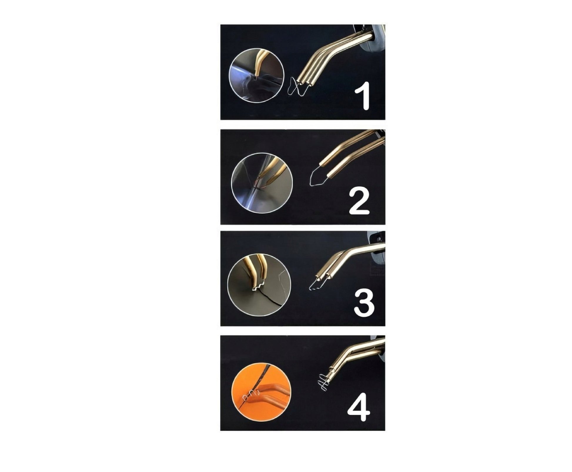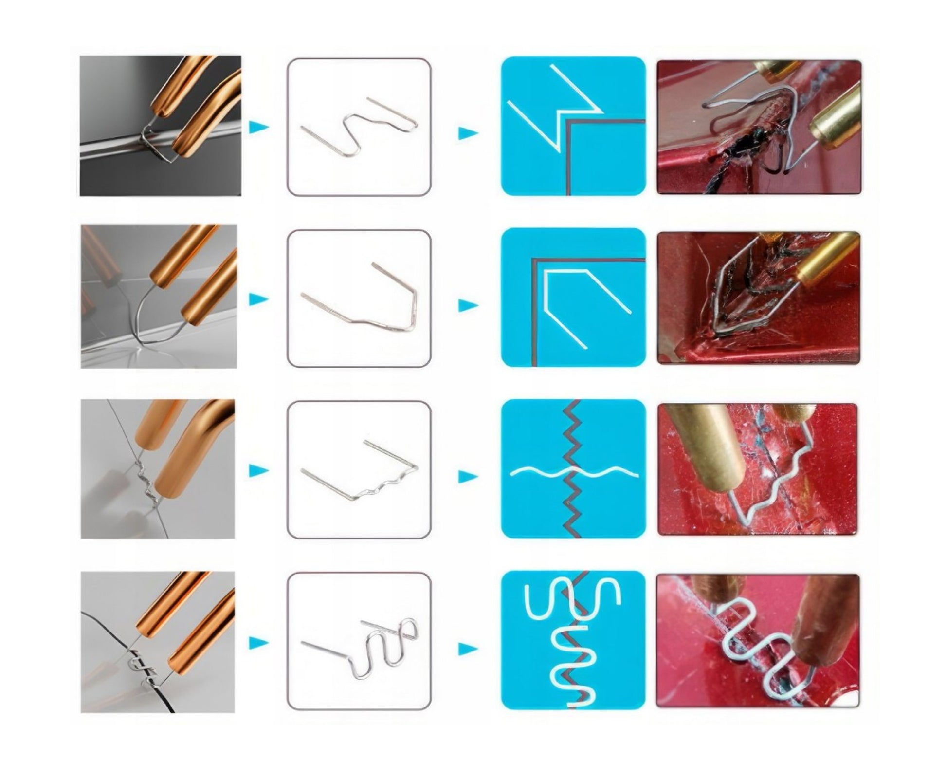 Datorita formei varfurilor, poti efectua sudura la suprafata care va conecta crapaturile sau le poti folosi ca capse. Pentru a face asta, scufunda varful peste crapatura si scoate-l de pe furca masinii de sudura. Dupa ce plasticul s-a racit, indoaie capetele proeminente astfel incat sa se rupa la acelasi nivel cu suprafata sudurii. O masina de sudat din plastic seamana ca design cu o pista de lipit si functioneaza intr-un mod similar. Pur si simplu conecteaza dispozitivul la o sursa de alimentare, plaseaza obiectul selectat in manere si apasa butonul.