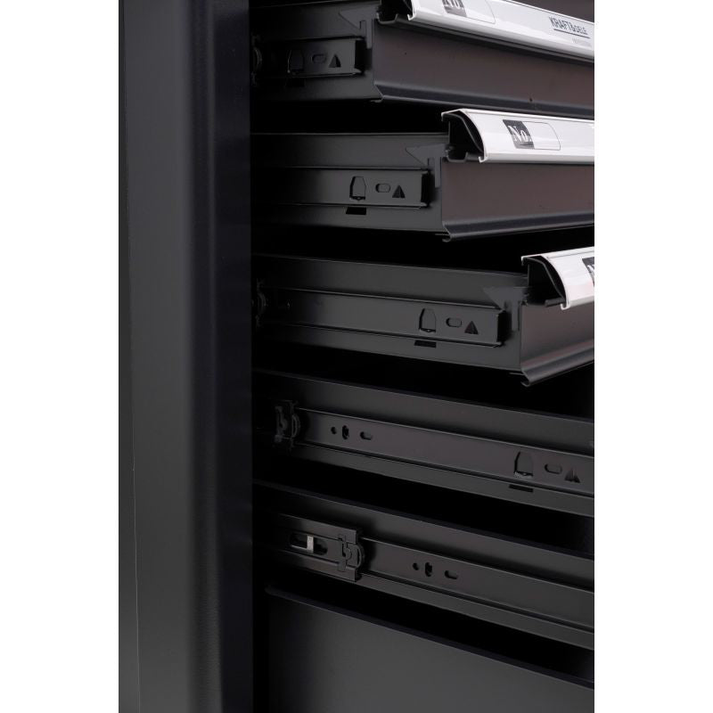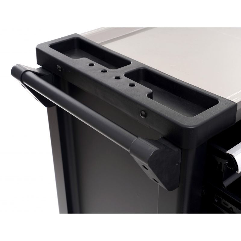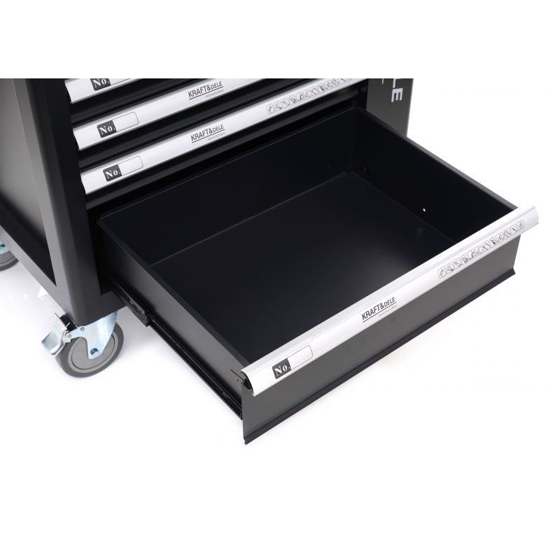 Are 7 sertare pe rulmenti cu bile si un compartiment de depozitare pe doua niveluri blocat cu o cheie. Sertarele au glisiere si un mecanism de alunecare cu rulmenti cu bile pentru o extragere usoara. In plus, fiecare sertar are o incuietoare. Designul permite montarea menghinei pe masa si suporturi suplimentare pentru prosoape sau substante chimice pe ambele parti ale caruciorului. Caruciorul este echipat cu 4 roti pivotante, care au o blocare automata si o frana, datorita carora este imposibil ca dulapul sa se miste. Ofera confort de siguranta chiar si pe pante mici. Sertarele sunt acoperite cu material EVA moale si elastic, care isi pastreaza proprietatile chiar si la temperaturi diferite.