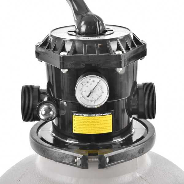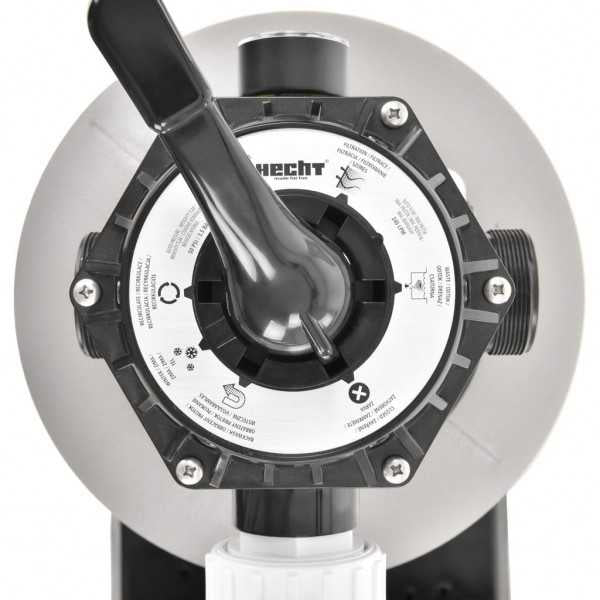 • Filtrarea este alimentata de la o retea standard de 230 V / 50 Hz. Puterea de filtrare este de 550 W. Recipientul mare pentru nisip filtrant are o capacitate de 45 litri, debitul de apa este de 7,9 m 3 pe ora. Filtrarea este echipata cu o supapa cu sase cai, pentru comutarea modurilor de filtrare, clatire, spalare in contra, iarna.