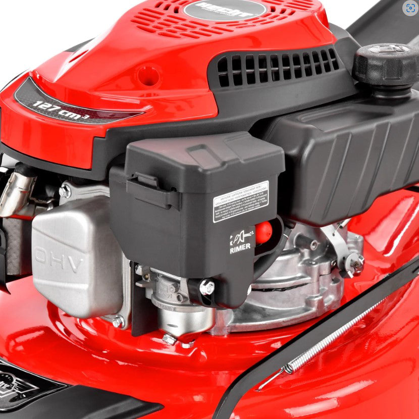 Masina de tuns iarba pe benzina cu cursa, potrivita pentru parcele mici si mijlocii de pana la 750 m2. Pe un sasiu din otel de inalta calitate este asezata o capacitate a motorului in patru timpi de 127 cm3 cu o putere nominala de 2 kW. Sub sasiu se roteste un cutit de otel cu o latime de 40 cm. Resturile de iarba sunt aruncate intr-un cos de 40 l din tesatura durabila. Reglarea inaltimii se realizeaza central printr-o singura parghie in intervalul 25 - 75 mm. Viteza de deplasare este de 3,4 km/h. Datorita piulitelor aripilor, manerul captusit de amortizare a vibratiilor poate fi pliat foarte usor si rapid la transportul masinii de tuns iarba sau la depozitarea acesteia.