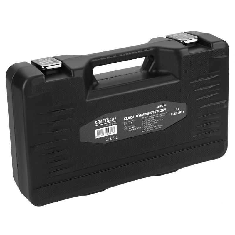 KD11394 este o cheie dinamometrica de precizie cu o gama de 5-25 Nm, ideala pentru aplicatii profesionale si amatori. Setul este plasat intr-o carcasa de plastic rezistenta, care asigura depozitarea si transportul convenabil. Un set larg de varfuri permite utilizarea versatila a uneltei in atelier, garaj sau in timpul lucrarilor de service.