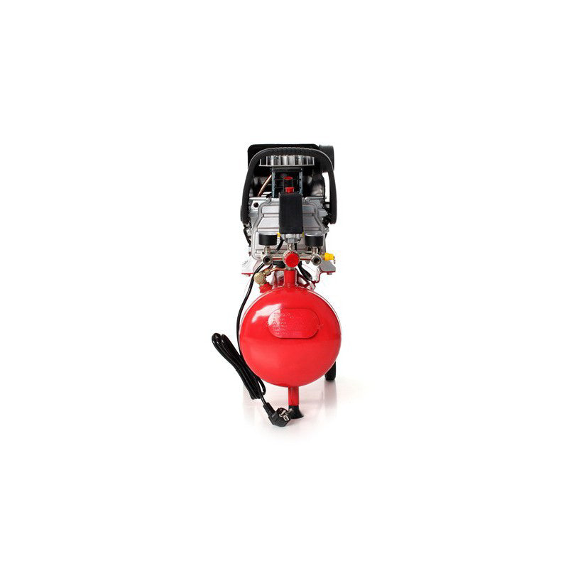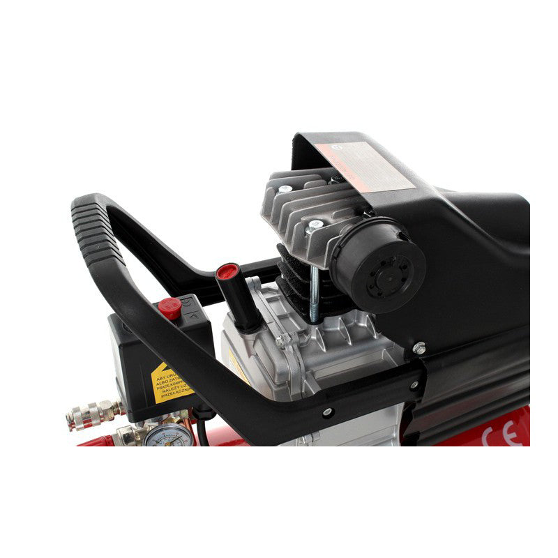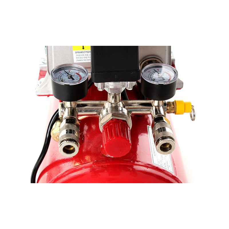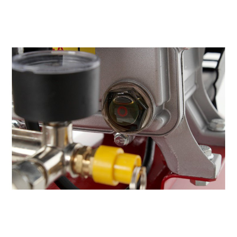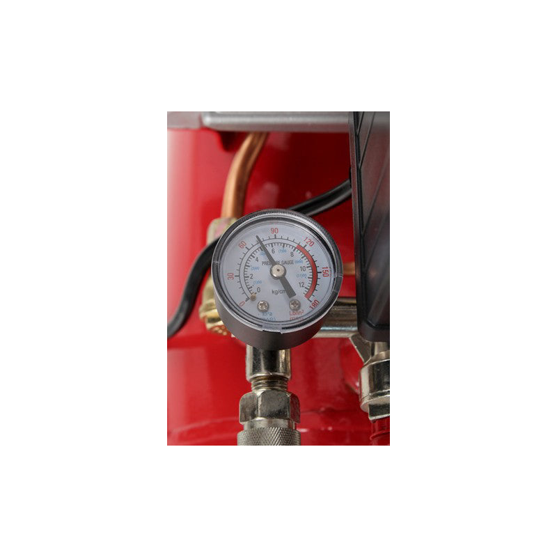 2 manometre mari intoarse in sus pentru a facilita citirea parametrilor (nu sa intors lateral la compresor ca in modelele mai ieftine ale unor vanzatori, in cazul in care trebuie sa se aplece in jos pentru a citi valoarea), si un robinet de scurgere convenabil.