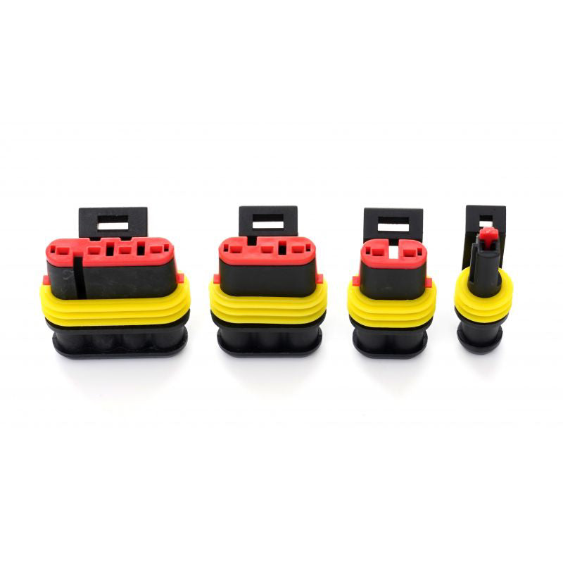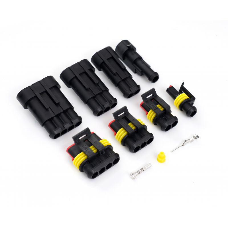 6 x conector carcasa tata, 6 x conector carcasa mama, 18 x pin tata, 18 x pin mama, 36 x mufa siliconica impermeabila