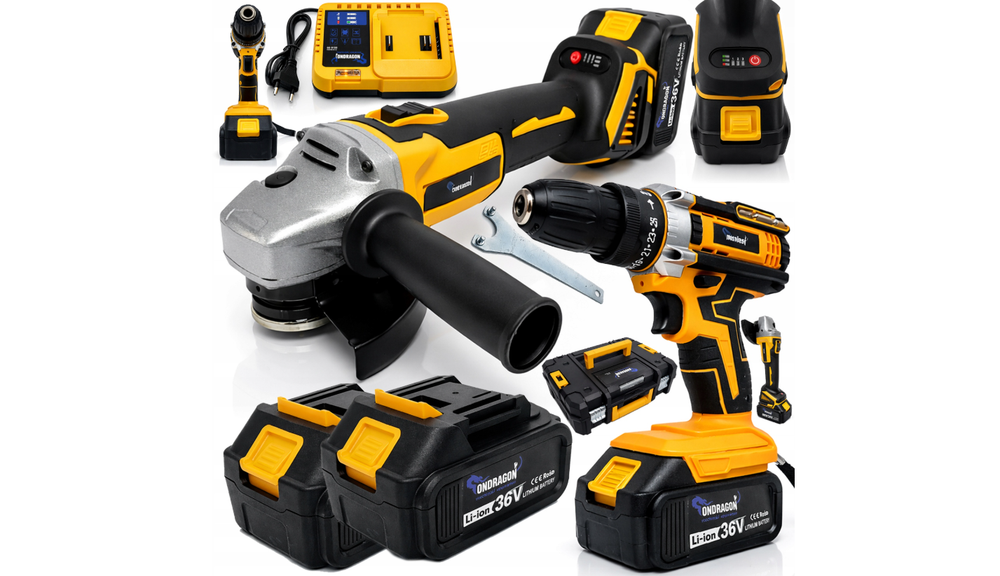 Set masina de gaurit si insurubat si polizor unghiular 2 in 1 cu acumulator, 36 V, Ondragon OD9139